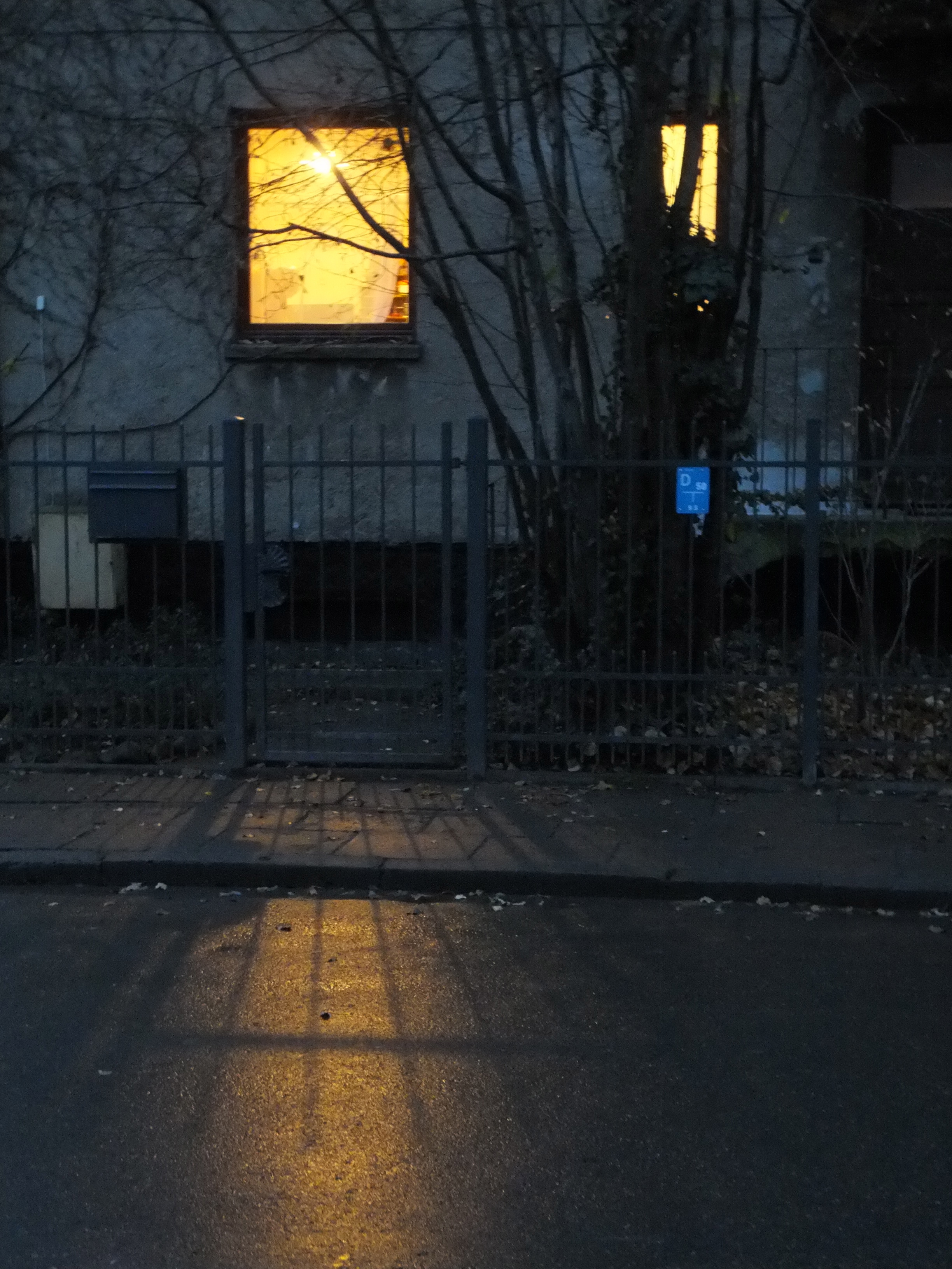 It’s been dark and rainy here the past week—the kind of dark where nightfall comes at around 4:00 in the afternoon. This is a house around the corner from us; what I love is the light from the window reflecting onto the street, with the shadows from the gate.